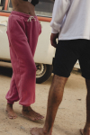 The joggers have a relaxed fit and convenient side pockets to hold all your small essentials. The elastic waistband with cotton drawstrings allows for an easy fit. A subtle wave embroidery on the leg and the "charming affection" inscription on the back pocket add a unique touch. Made of 90% organic cotton and 10% polyester, with a weight of 400g, they are soft, durable, and pleasant to the touch.
