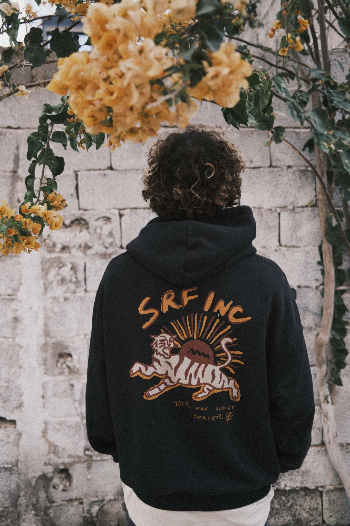 On the front, a subtle print "Your fav sunset dealer", the back, however, attracts attention with a large print of a tiger and "Surf Inc.". Additionally, we added a delicate detail in the form of a falcon on the sleeve. A flag label is sewn into the side seam - subtle, but characteristic finish. Made in Poland.
