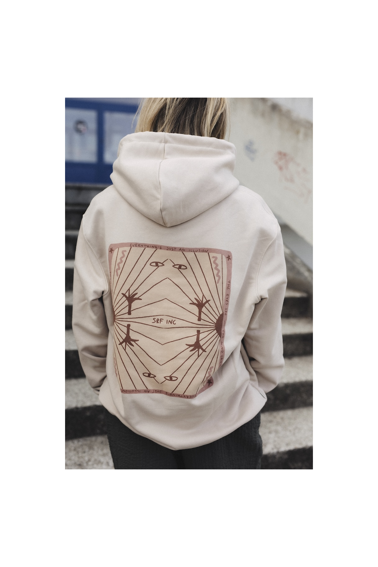 La felpa Just Illusion in colore Cookie è un classico con un tocco in più. Una vestibilità ampia e comoda, adatta sia per lei che per lui. Realizzata con il 90% di cotone biologico e il 10% di poliestere con un peso di 320 g, con un interno grattato - estremamente morbida, calda e piacevole per il corpo. Sul davanti una piccola stampa combinata con un ricamo, e sul retro una grande grafica geometrica. Inoltre, abbiamo aggiunto un ricamo sottile sulla manica, che completa il tutto.