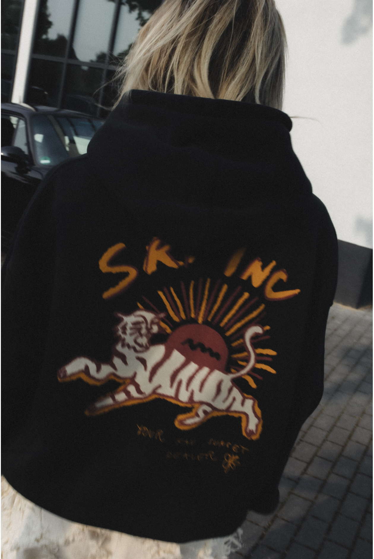 Na froncie subtelny nadruk “Your fav sunset dealer”, tył za to zdobywa uwagę dużym nadrukiem tygrysa i “Surf Inc.”. Dodatkowo na rękawie dodaliśmy delikatny detal w postaci falki. W bocznym szwie wszyta jest metka chorągiewka - subtelne, ale charakterystyczne wykończenie. Wyprodukowano w Polsce.